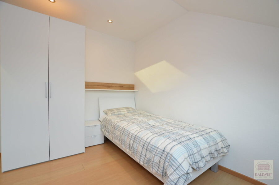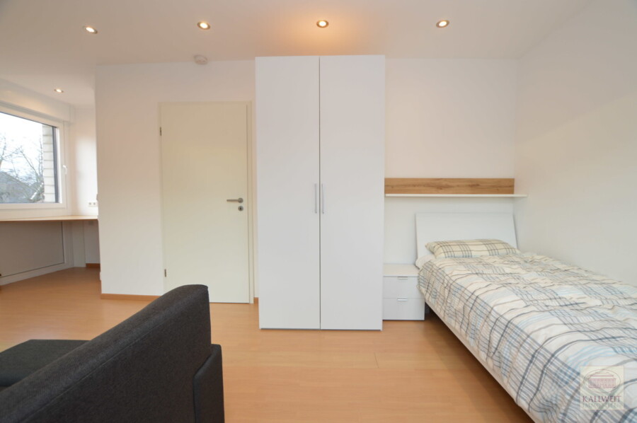 Ausstattung: Modernes Mobiliar; Wohn- Schlafraum mit Einzelbett, Kleiderschrank, Schreibecke, graue Couch mit Stoffbezug, Kabel-TV und Sideboard. Küchenzeile mit Ceranfeld, Backofen, Hoch-Kühlschrank, Kaffeemaschine, etc. Essecke mit Glastisch und 4 Stühlen.