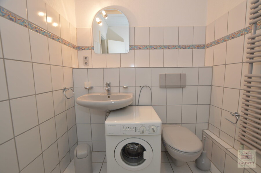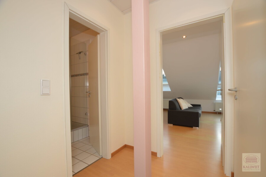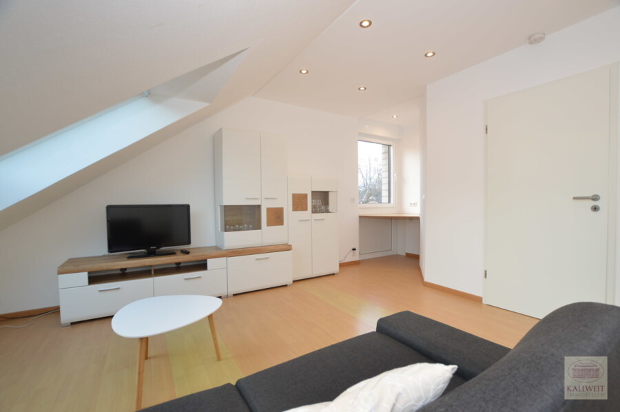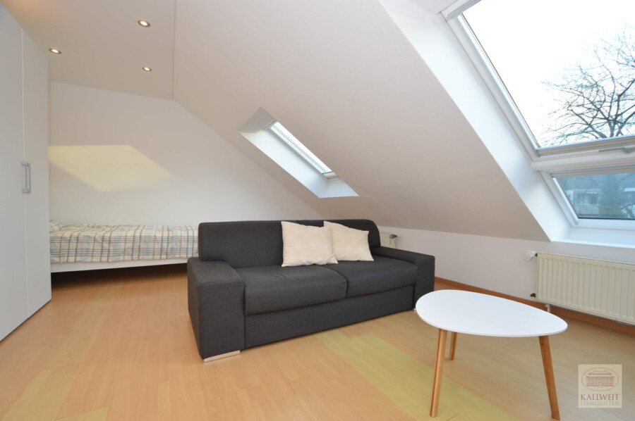 Aufteilung: Eingangsbereich / kleine Diele mit Zugang zu allen Räumen. Heller Wohn-/Schlafraum mit Arbeitsecke; große Dachflächenfenster mit Innenrollo.