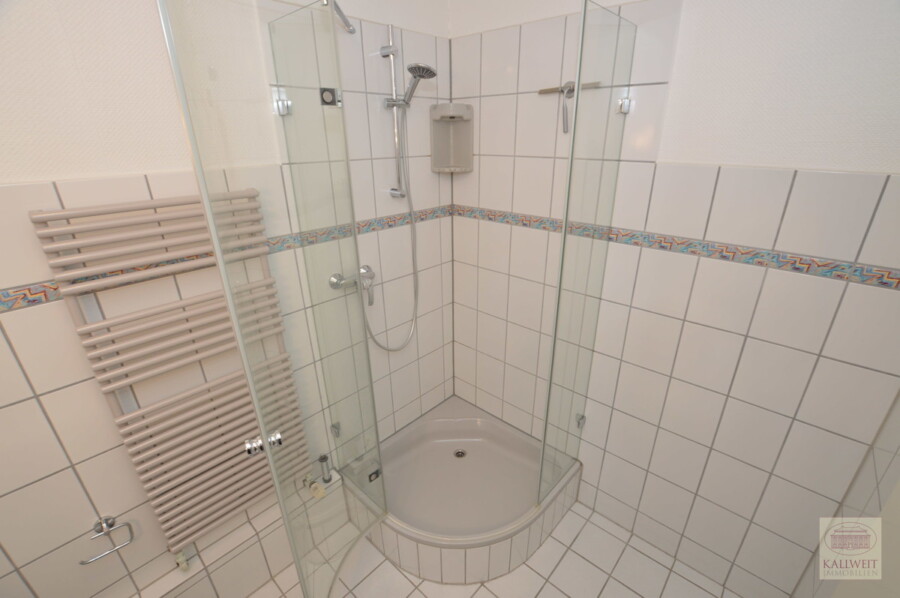 Innenliegendes Duschbad mit großzügiger Glaskabine und Waschmaschine.