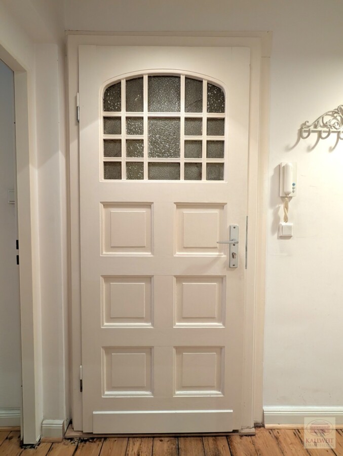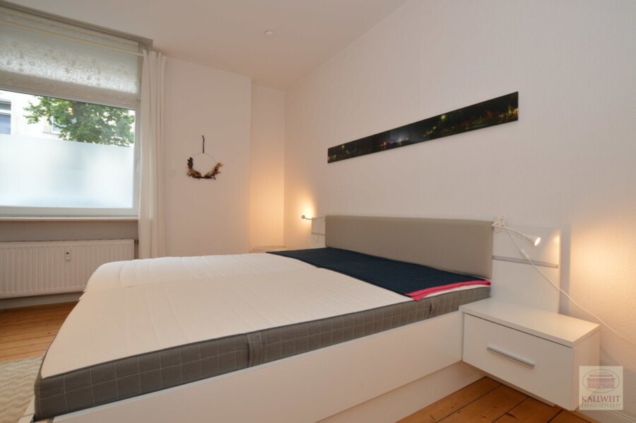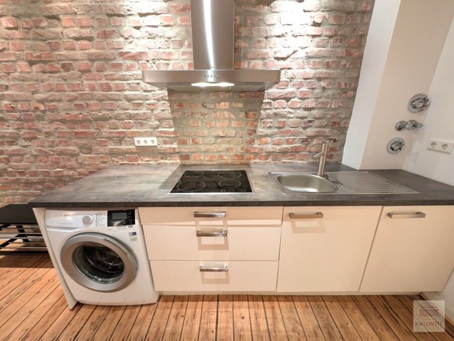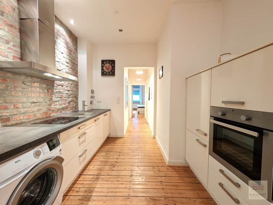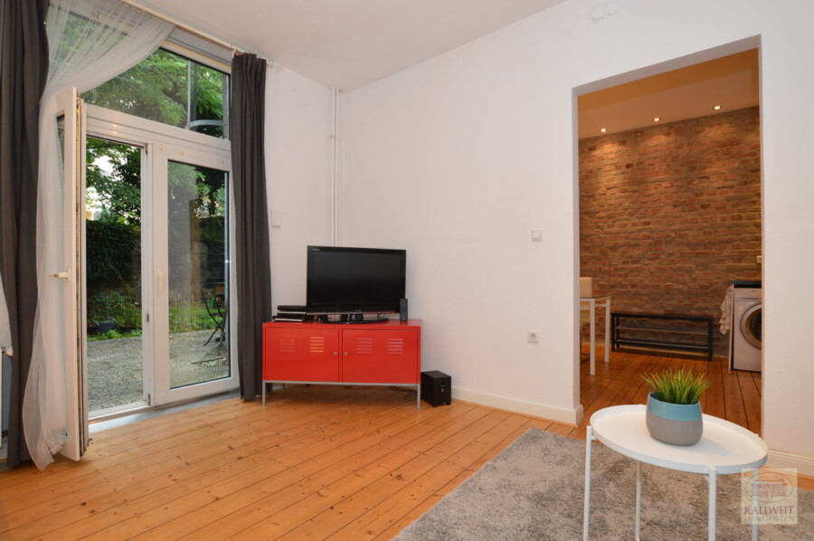 Die Wohnung wurde vor wenigen Jahren aufwendig saniert und dabei schlicht-modern gestaltet. Aufteilung: Eingangsbereich / Diele mit Zugang zum Schlafzimmer (Vorderseite des Hauses), dem innenliegenden Duschbad sowie der großen Wohnküche. Von der Küche aus, gelangt in das Wohnzimmer. Über ein bodentiefes Fenster ist die Terrasse im begrünten Innenhof zu erreichen.