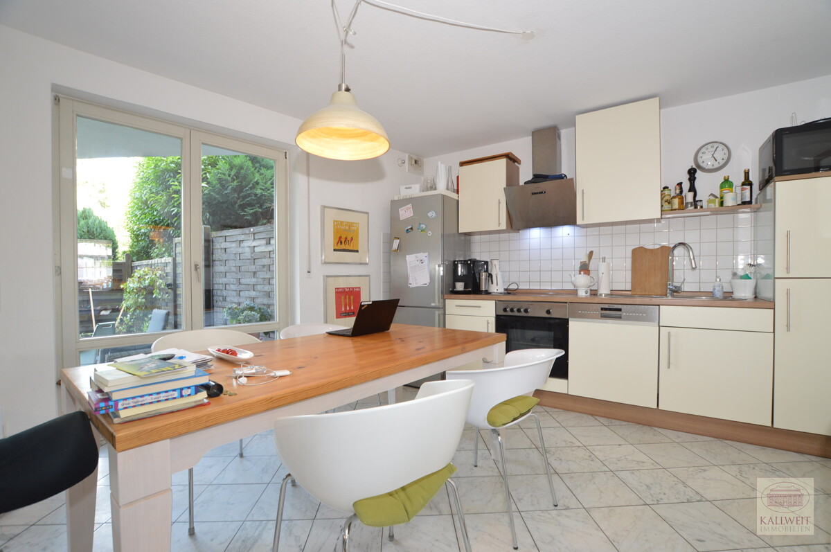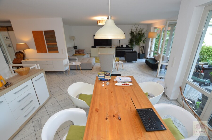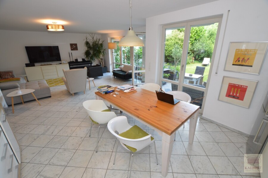 Über bodentiefe Fenster kann von der Küche als auch vom Wohnbereich den Garten bzw. die Terrasse erreichen.