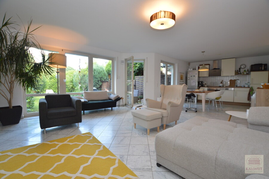 Über bodentiefe Fenster kann von der Küche als auch vom Wohnbereich den Garten bzw. die Terrasse erreichen.