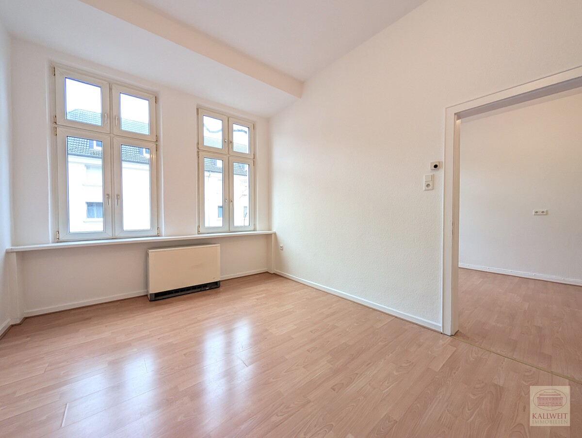 Über die zentrale Diele gelangt man in das Wohnzimmer. Eine Tür verbindet dieses mit dem Schlafbereich. 2 große Fensterfronten mit Oberlichtern sind zur Vorderseite des Hauses ausgerichtet. Zwischen Wohnbereich und Küche befindet sich ein modernisiertes, weißes Wannenbad. Die große Wohnküche verfügt über viel Platz für die eigene Wunschküche und einem geräumigen Essplatz. Nützlich: eine kleine, charmante Speisekammer mit Fenster.