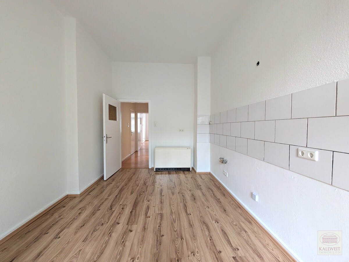 Laminatboden in allen Räumen. Die Wände sind mit Rauhfaser tapeziert und weiß gestrichen. Küche weißer Fliesenspiegel. Bad ist ebenfalls weiß gefliest.