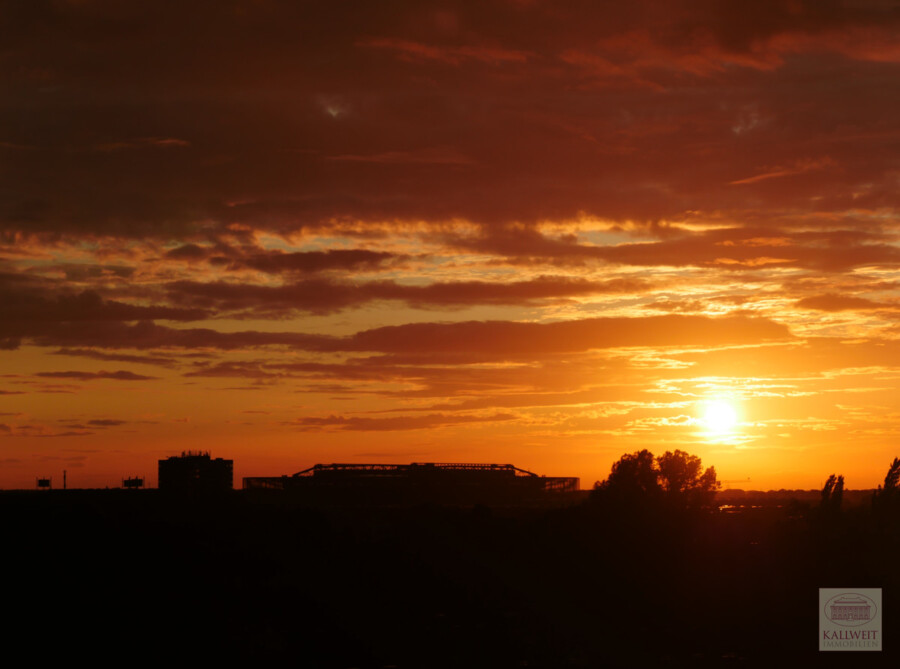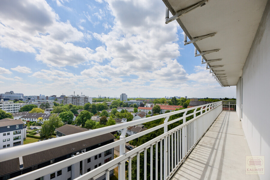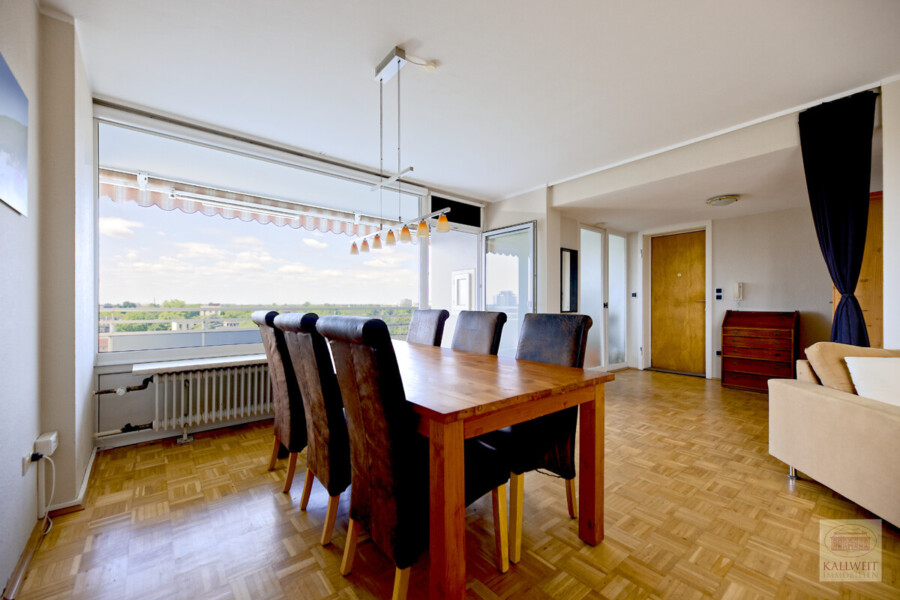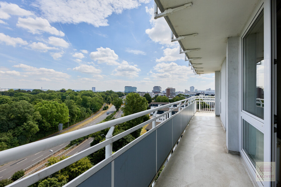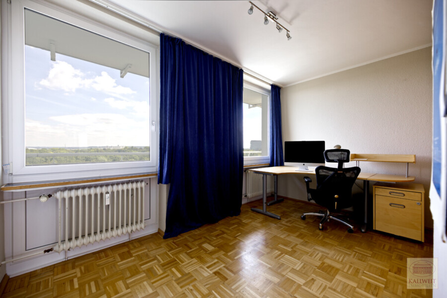 Die angebotene Wohnung befindet sich in einer der Landmarken des Düsseldorfer Nordens. Das Hochhaus entstand nach Plänen des bekannten Prof. Nothhelfer zu Ende der 1950er Jahre und ist weithin sichtbar. Die Wohnung liegt in der 8. Etage und hat zu drei Seiten des Hauses Fenster sowie einen umlaufenden Balkon. Die Loggia ist nach Westen ausgerichtet und bietet einen wunderbaren Blick auf Stadt, Rheinbrücken und den Sonnenuntergang.