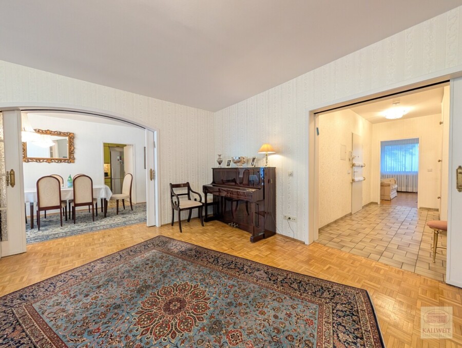 Aufteilung: Große Diele / Eingangsbereich, mit Zugang zum Gäste-WC und Duschbad. Dem Badezimmer ist ein Nebenraum für Waschmaschine & Trockner zugeordnet. An der Vorderseite des Hauses liegt das repräsentative Wohnzimmer, das Esszimmer sowie die Küche. Eine weitere Diele, die ebenfalls über ein separates WC und ein Bad verfügt, verbindet den Essbereich mit einem Gäste- / Arbeitszimmer sowie zwei Schlafzimmern. Vom zweiten Schlafzimmer gelangt man wieder in den Eingangsbereich der Wohnung.