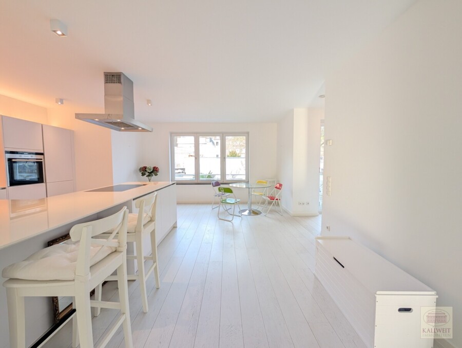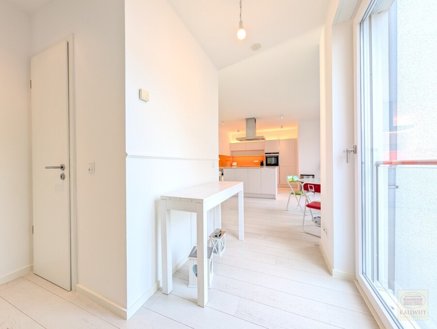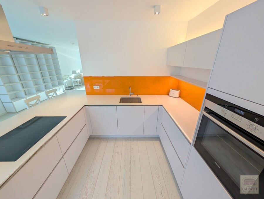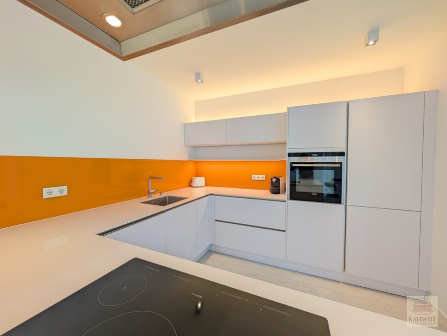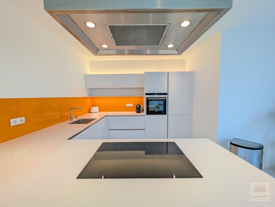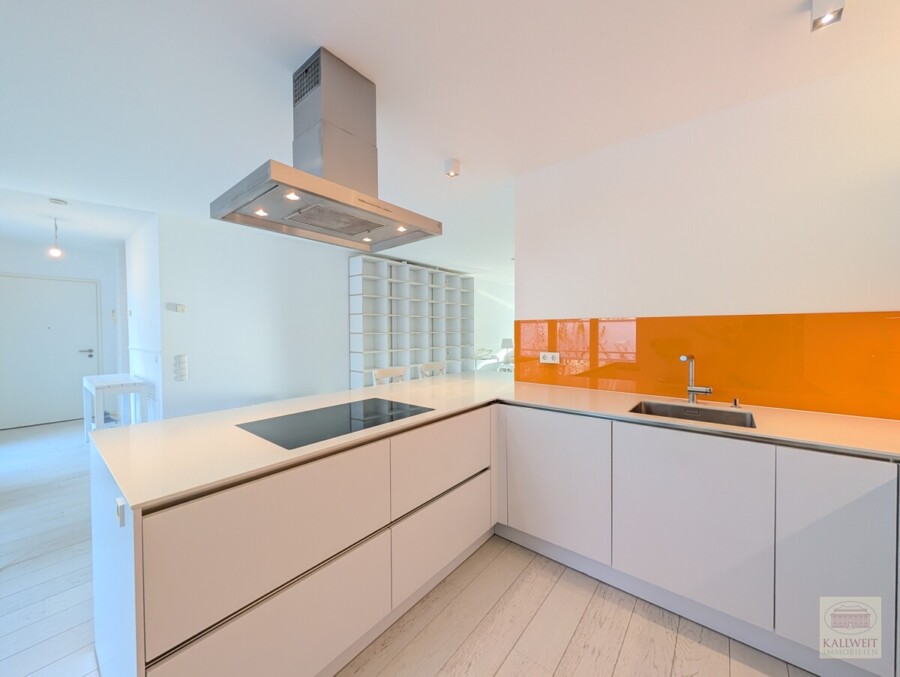 Highlight der Wohnung ist die hochwertig und schnörkellos gestaltete Einbauküche. Es stehen den Bewohnern eine Vielzahl von Einbaugeräten und maximaler Stauraum zur Verfügung. Neben der Küche befindet sich zusätzlich ein Hauswirtschaftsraum.