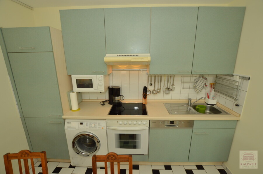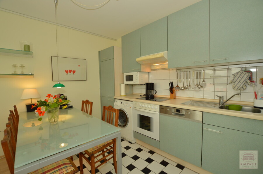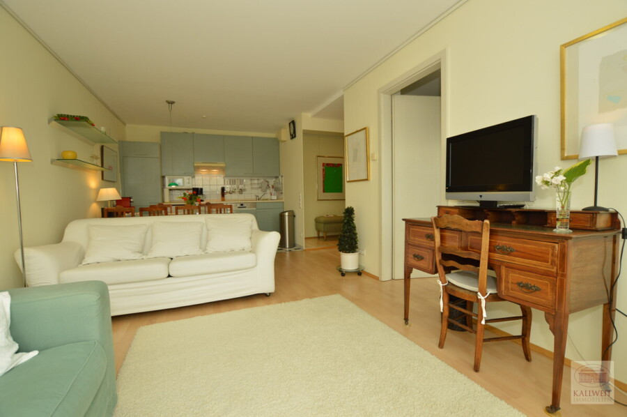 Insgesamt eine sehr geschmackvolle Neubauwohnung mit Antiquitäten und Designermöbeln. Der Essbereich verfügt über einen Glasesstisch mit antiken Stühlen, einer Küchenzeile mit Spülmaschine und Waschmaschine, sowie einer kleinen Stereo-Anlage. Der Wohnbereich ist mit einer hellen und türkisen Couch, kleinem Sekretär und Kabel - TV möbliert.In der Diele befindet sich ein Einbauschrank und eine Vorratskammer. Der Boden ist im gesamten Wohnbereich mit Parkett ausgelegt.
