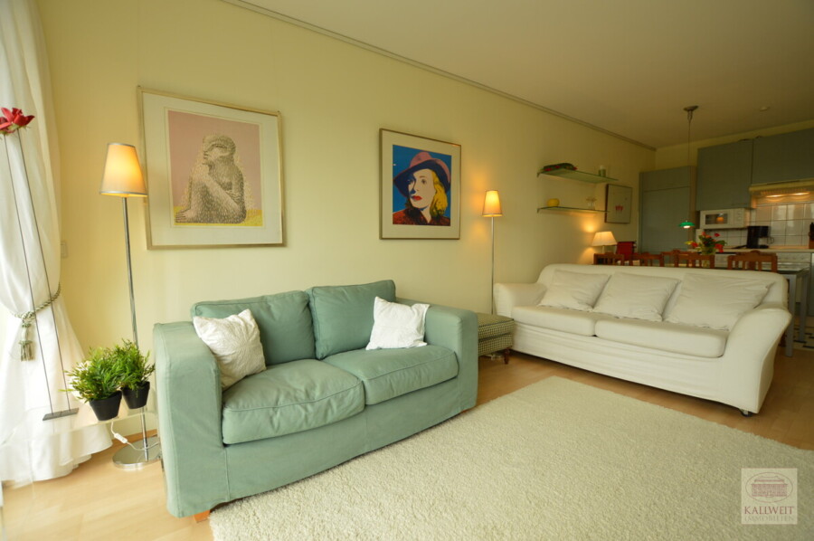 Helle und stilvolle 2- Raum Wohnung ca. 55qm im 6.OG eines modernen Stadthauses. Aufteilung: Wohnraum mit offener Küche und Essbereich, Sitzecke, Balkon. Separater Schlafraum mit zwei Einzelbetten, die aber wahlweise zu einem Doppelbett verbunden werden können. Das Bad ist mit Dusche und einer sep. Wanne ausgestattet.