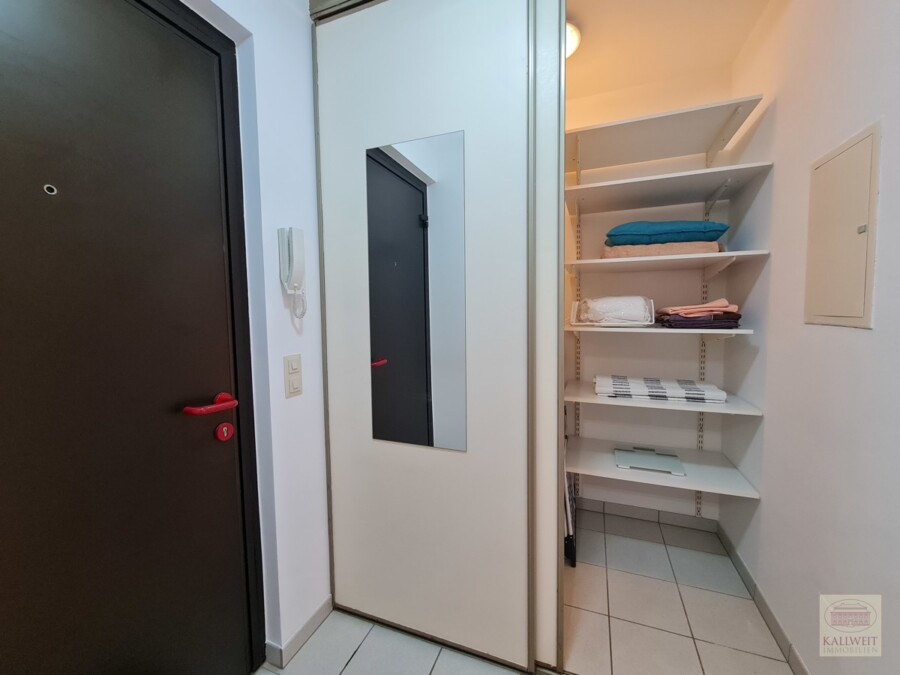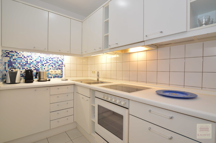Seitlich zum Wohnbereich (mit einer Wand vom Wohnraum getrennt) befindet sich eine offene und komplett eingerichtete Einbau-Küche in weiß. Ein begehbarer geräumiger Kleiderschrank steht im Dielenbereich zur Verfügung. Das blau geflieste, innenliegende Bad verfügt ist mit einer Wanne ausgestattet.