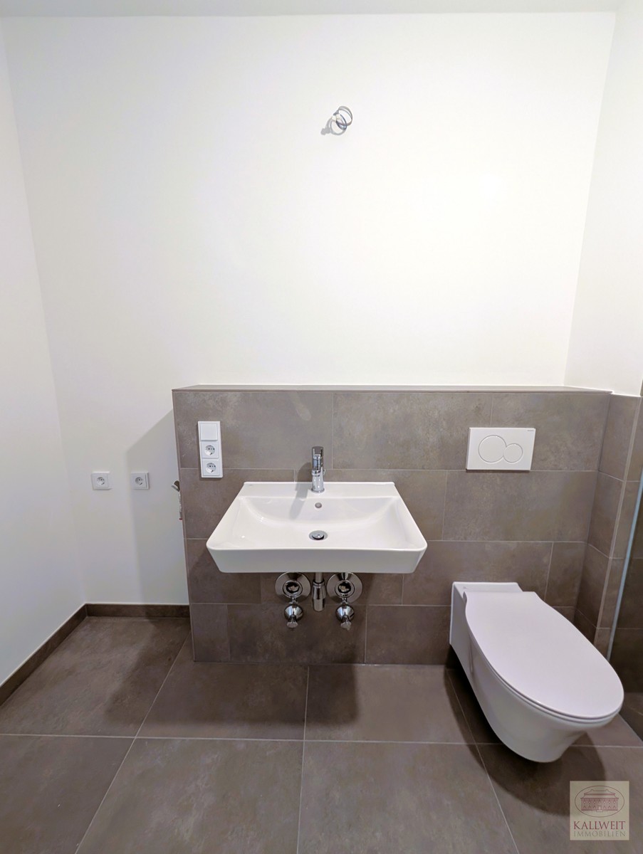 Im Badezimmer ist eine Nische mit Anschlüssen für die Waschmaschine.
